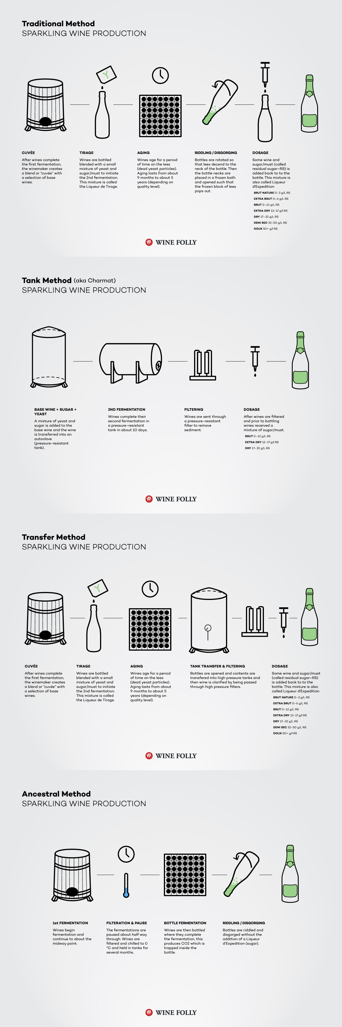 There are 6 major methods by which sparkling wines are produced, each resulting in a different carbonation level and, ultimately, a different style of bubbly! We’ll discuss all the styles, but the two worth paying attention to the most are Traditional Method (used for Champagne, etc) and Tank Method (used for Prosecco, etc).