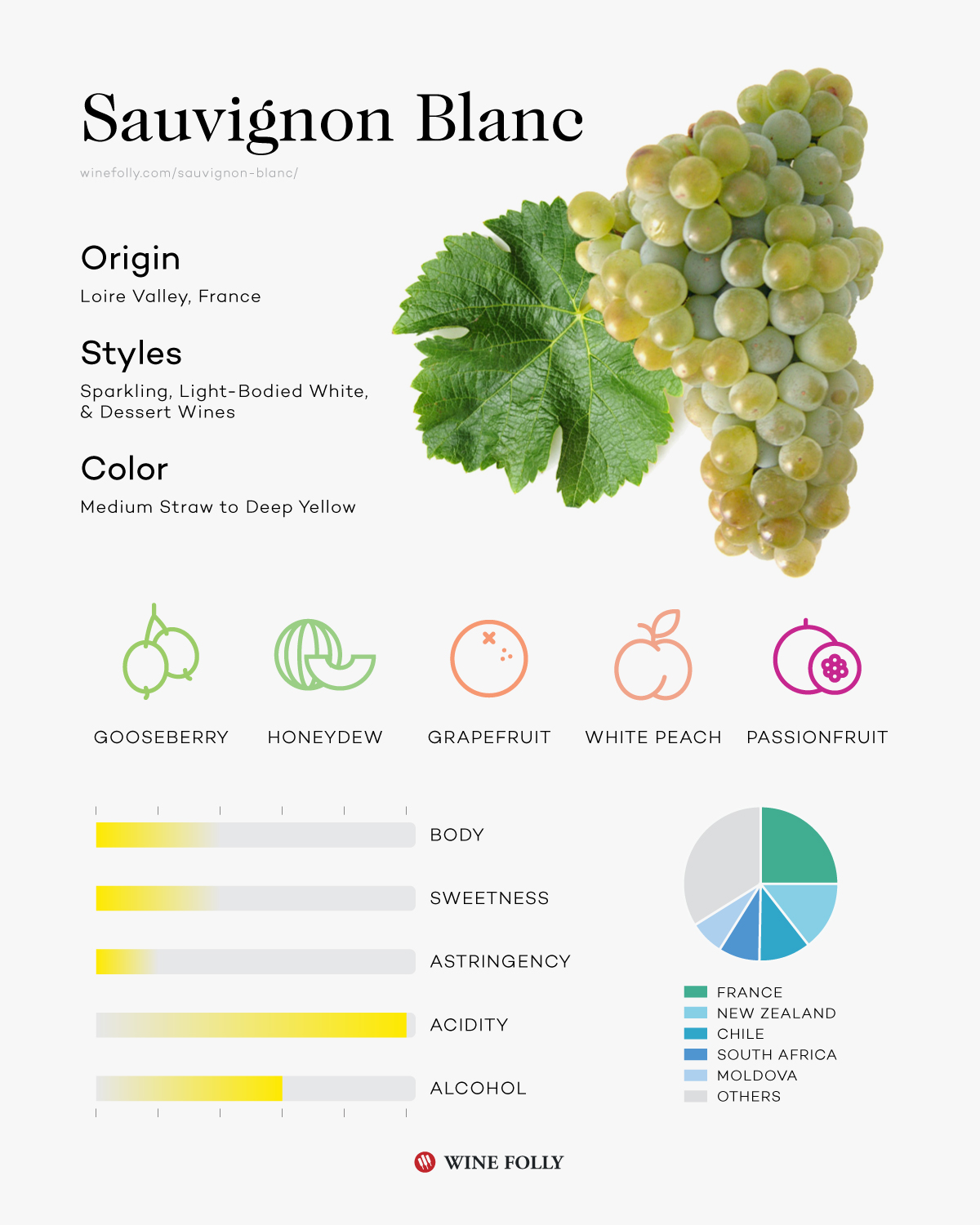 - France: Sauvignon Blanc is arguably best when grown in the Loire Valley. The cool climate produces a fruity, tart wine with lively acidity.