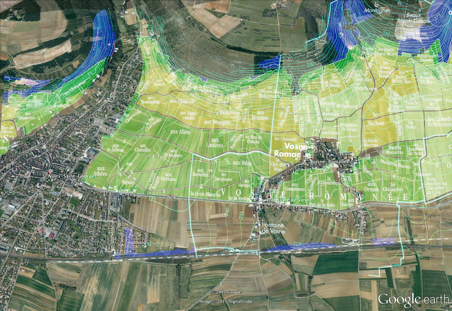 Precisely delimited “climats” (vineyard parcels) on the slopes of the Côte de Nuits and the Côte de Beaune south of the city of Dijon.