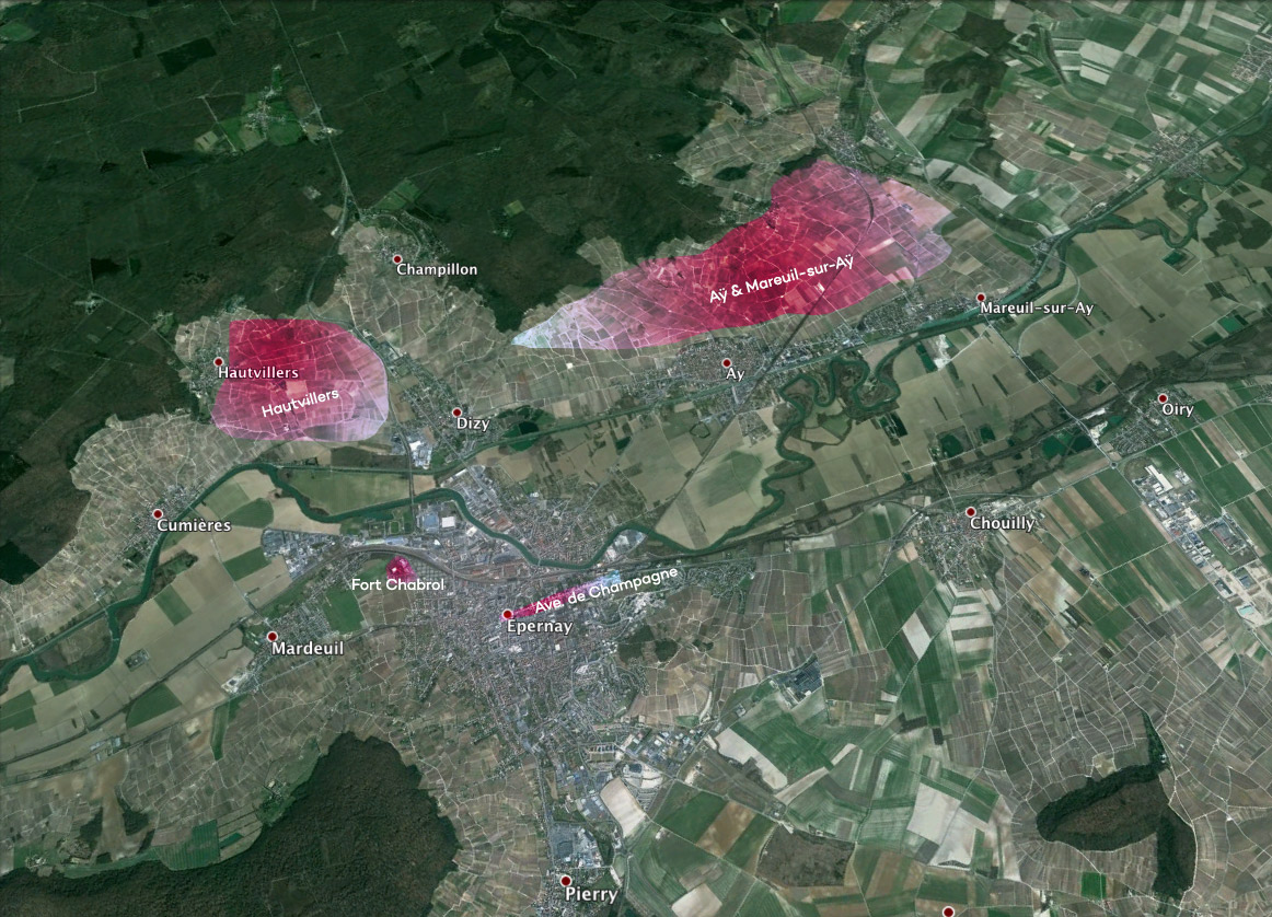 The historic vineyards of Hautvilliers, Aÿ and Mareuil-sur-Aÿ, Saint-Nicaise Hill in Reims, and the Avenue de Champagne and Fort Chabrol in Épernay.