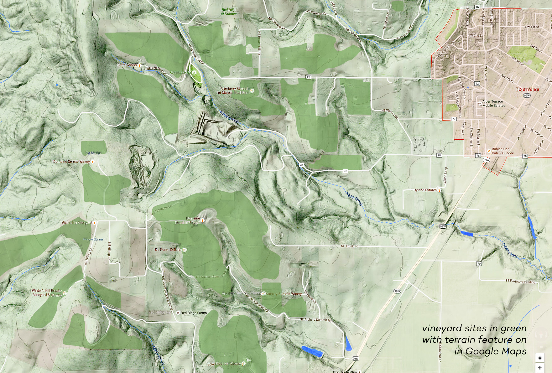 A brief look at Google Maps in the Dundee Hills AVA shows that the same applies to some of Oregon’s top vineyards.