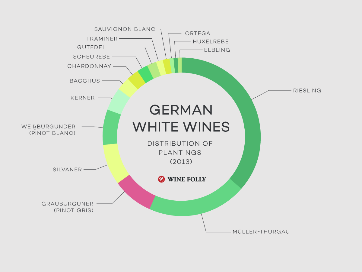 In 2013, white wines made up 64.5% of the total vineyard area of Germany. Riesling is Germany’s most important grape but there are some other fascinating esoteric whites to know. Statistics from Deutscheweine.de