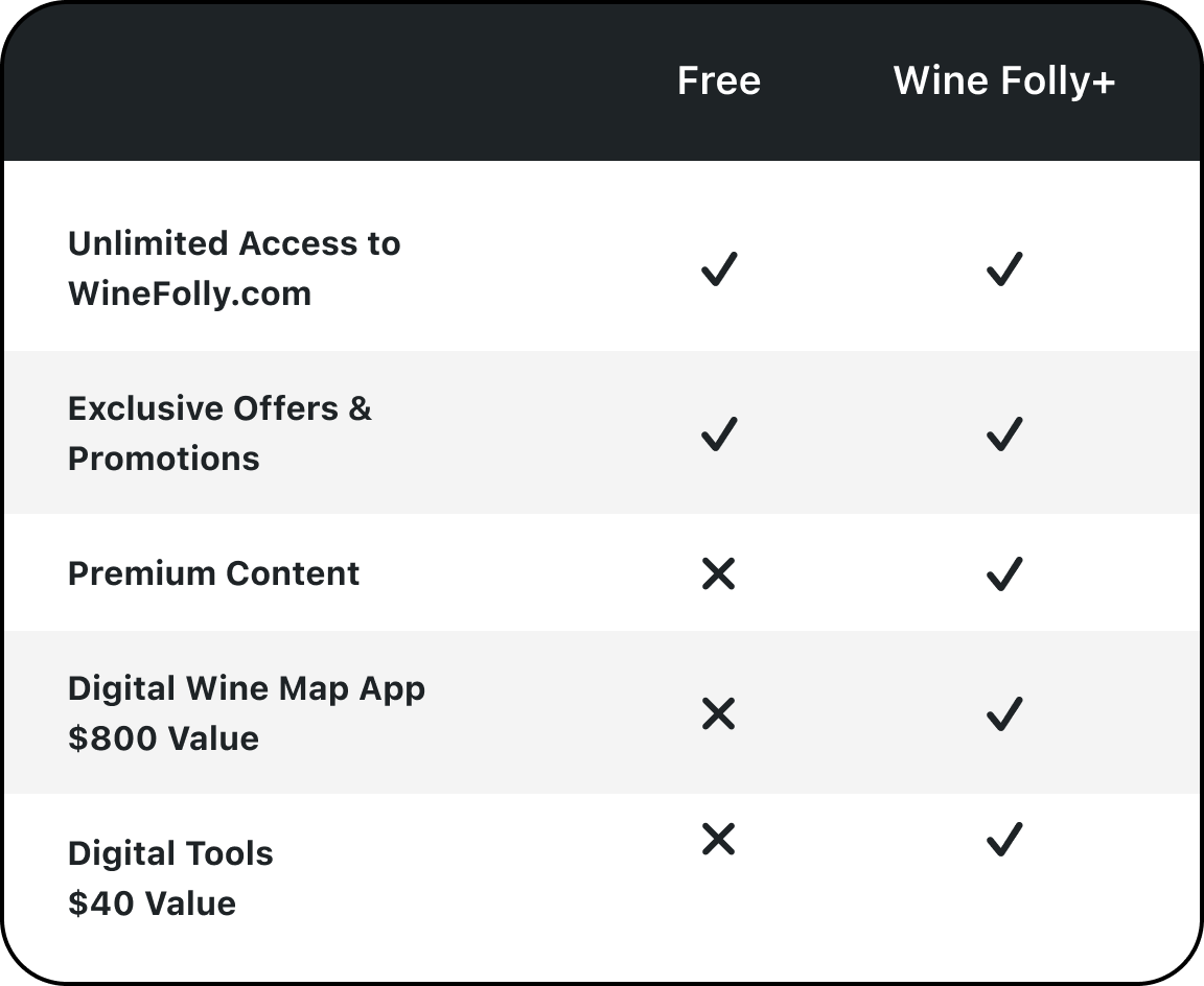 Start your wine journey for free, then unlock Wine Folly's complete collection of premium digital tools, wine maps, guides, and resources with Wine Folly+. Upgrade anytime for just $99/year.